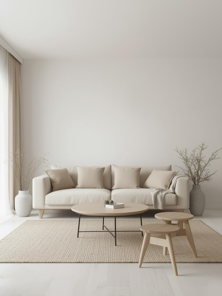 In 2026, jute, wool, and woven rugs are especially popular. These textures enhance the cozy feel while keeping the design neutral and balanced. Paired with a beige sofa, textured rugs create a grounded and inviting living room.