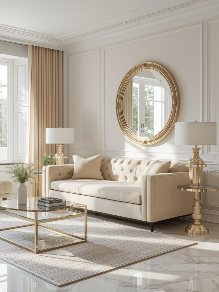 Mirrors are a powerful design element in beige sofa living rooms, helping reflect light and create the illusion of more space. A well-placed mirror brightens the room and enhances the neutral color palette. It also adds elegance without adding clutter.