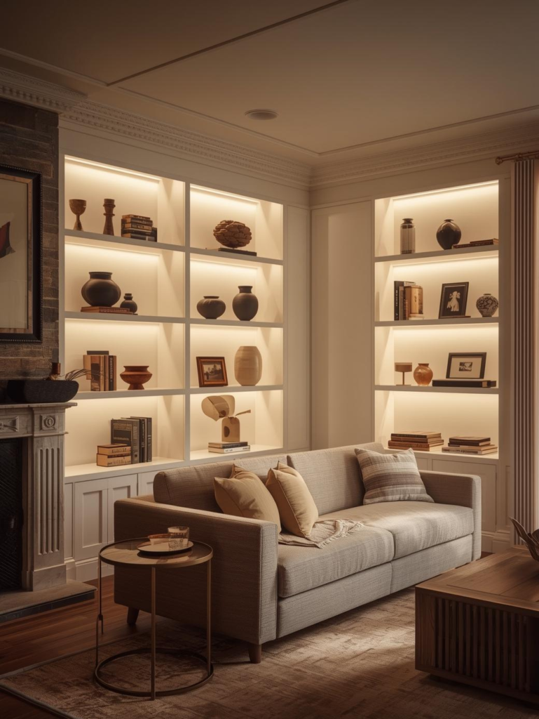 In 2026, built‑ins are styled with intention and minimalism. Balanced shelf decor paired with a beige sofa creates a clean, organized look. This design feels practical, elegant, and highly appealing for Pinterest audiences.