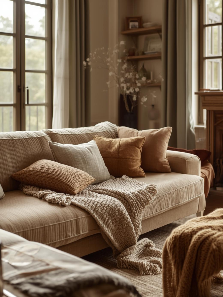 Cozy throws instantly make a beige sofa living room feel more comfortable and welcoming. Draping a throw over the sofa adds warmth and creates a relaxed, lived-in look. This simple styling trick enhances comfort while adding visual texture to the space.