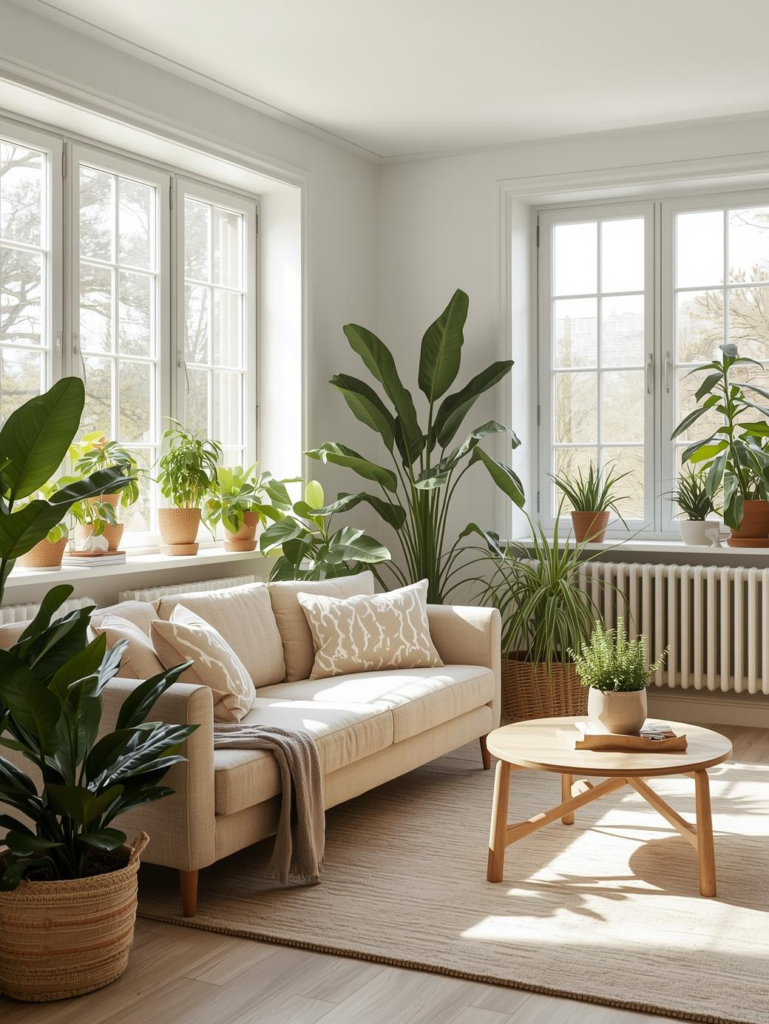Indoor plants instantly refresh a beige sofa living room by adding color and life. Greenery contrasts beautifully with neutral tones, making the space feel vibrant without overwhelming the design. Plants also help soften clean lines and bring a natural, relaxed feel to the room. This style is perfect for nature‑inspired interiors.