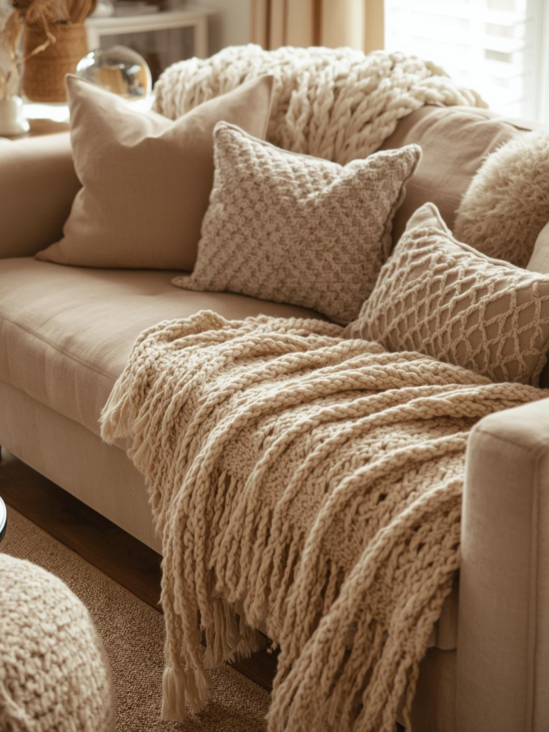 In 2026, chunky knit and soft woven throws are especially popular. Neutral and earthy tones work best with beige sofas. These throws help create a cozy atmosphere while keeping the living room stylish and Pinterest-worthy.