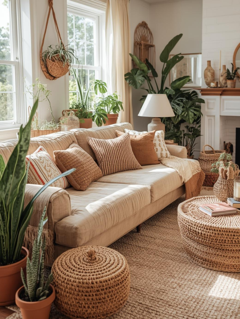 A beige sofa paired with boho touches creates a relaxed and inviting living room that feels personal and warm. Woven baskets, textured cushions, and handcrafted decor add character without overpowering the neutral base. The beige sofa keeps the space grounded, allowing boho elements to shine naturally. This style works beautifully for homeowners who love comfort with a creative, free‑spirited feel.